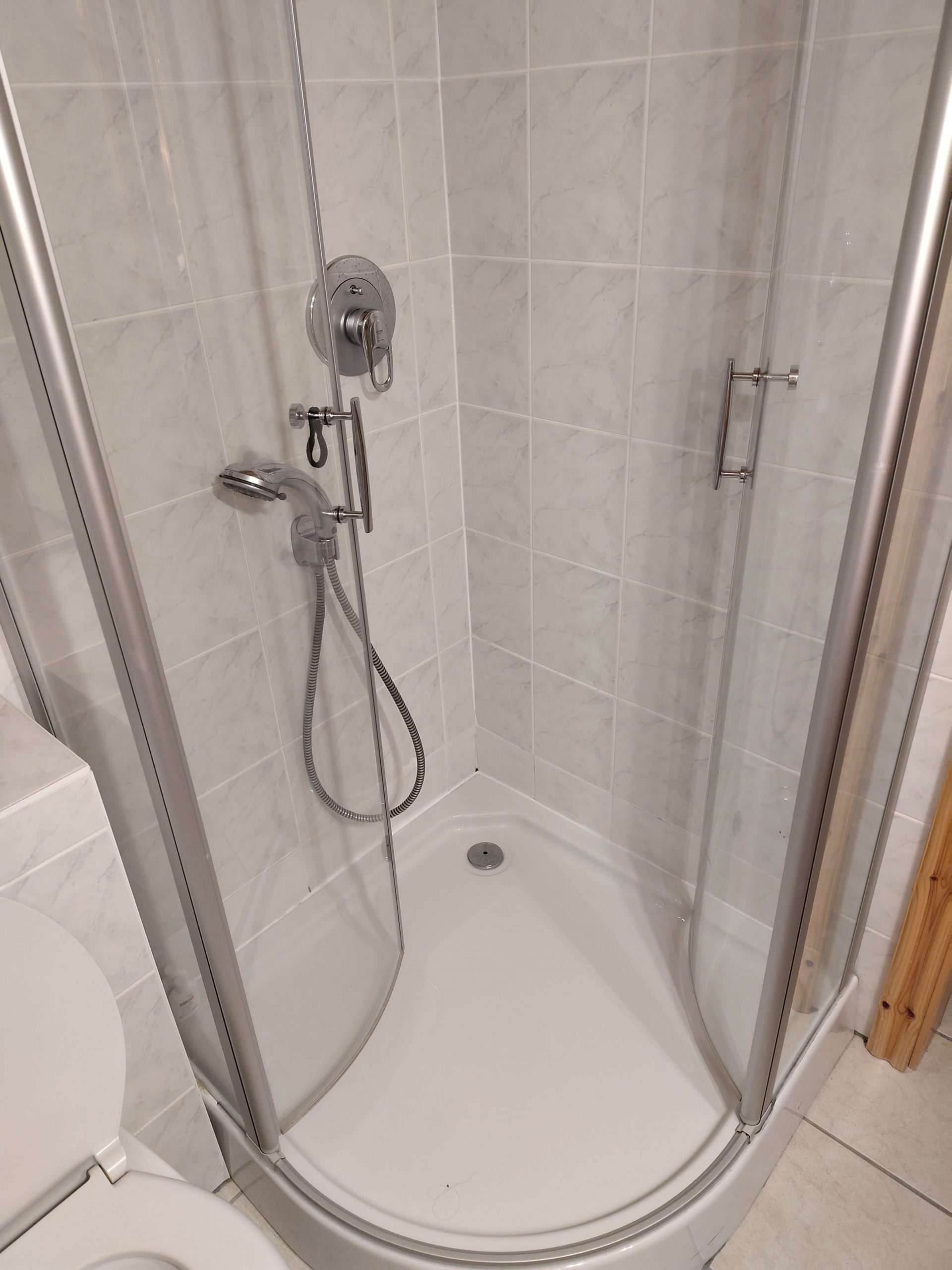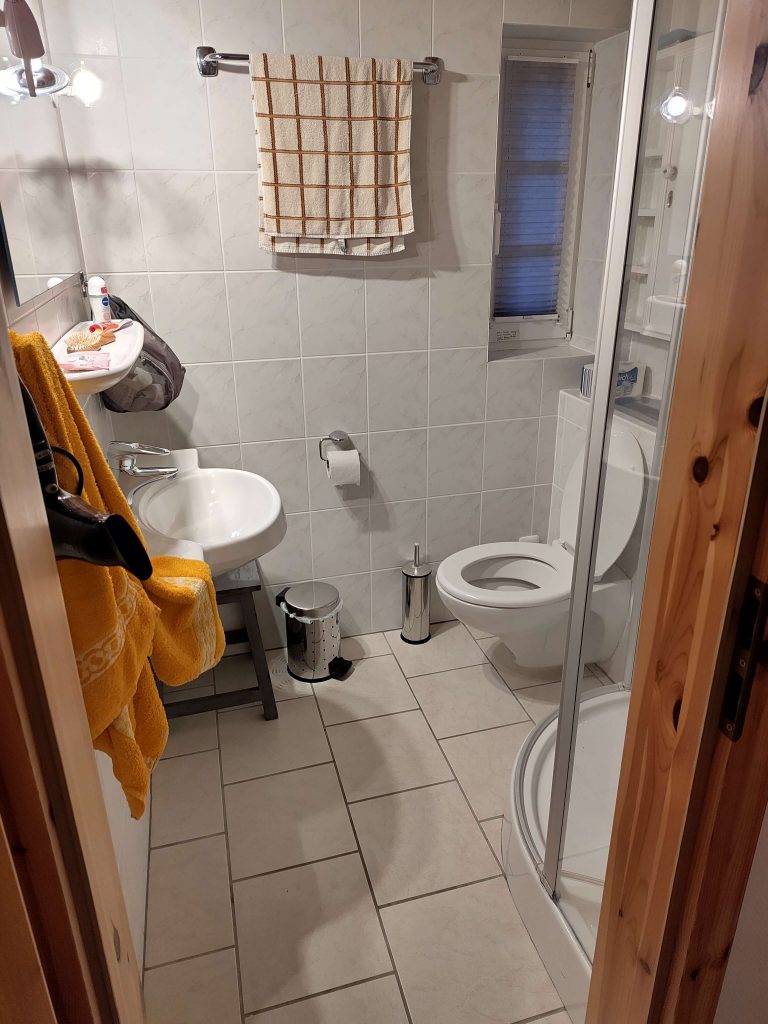 Ein komplett ausgestattetes Badezimmer mit Dusche, Toilette und Waschbecken. Ein zusätzliches Kompostklo